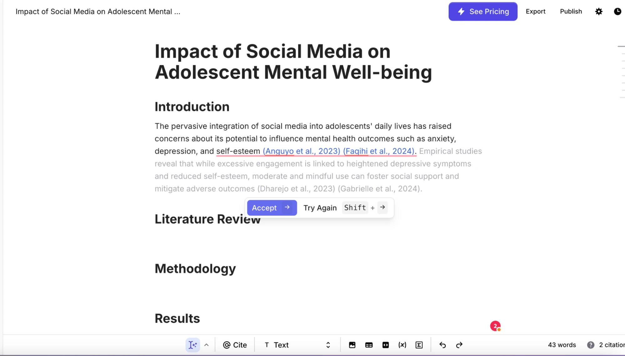 Jenni AI is an advanced writing assistant that can help college students as well as researchers create structured content tailored to their personal needs. It provides real-time suggestions, citations, and clarity improvements to help you effectively polish your academic writing.
