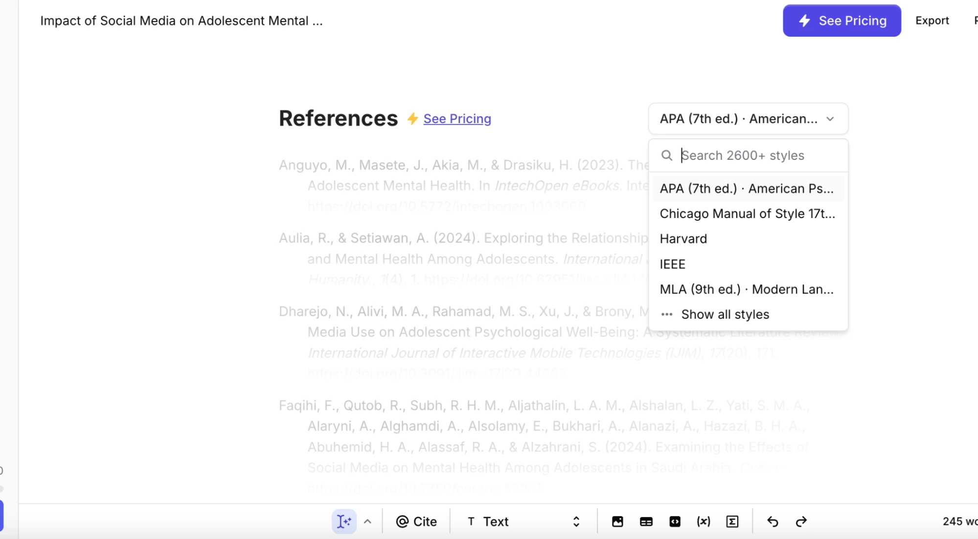 I like the idea that I can change the formatting style on the go, and you won’t need to rewrite the whole text if you set the wrong citation style when prompting.