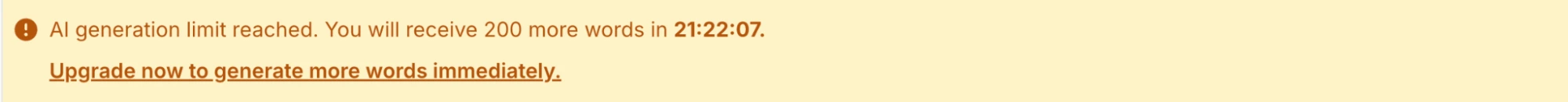 Well, talking about the weakest sides, we should definitely name the word limit. With a free plan, it is just 200 words, and this is too little even for high school students. When you reach the limit, you will see the following notification.