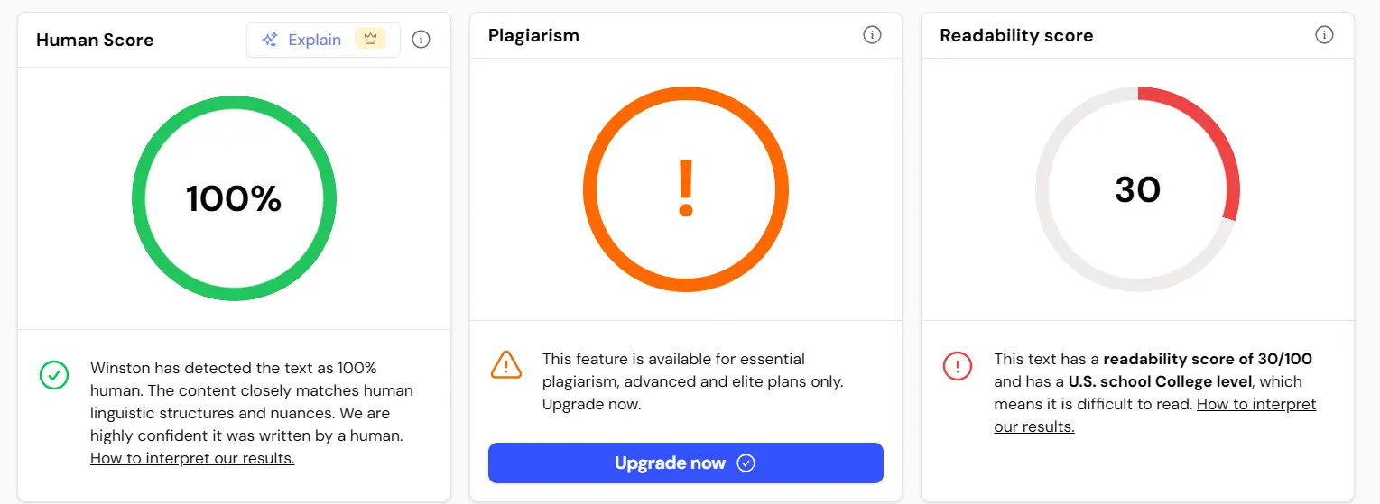 I got more encouraging results with Winston AI, as it did not detect any sign of AI-generated content. Nonetheless, it did highlight the low readability score of 30%, and it’s not surprising. The humanized version of my article needed a strong editing stage, which I skipped for the sake of this test. Many sentences sounded awkward and were confusing, so it's no wonder Winston AI was polite enough to give this text such a high percentage of readability when, in reality, it should have been a lot lower.